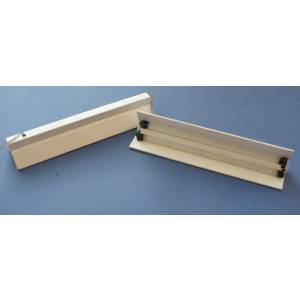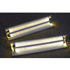 The first fluorescent lights were made for a customer who could not find any for a project she was working on. These are made with four (4) LED pure white chips mounted to the ends of two clear acrylic rods. They look quite authentic and use only 7 ma. of current and puts off virtually no heat. They will work only on 9- or 12-volt DC. They are made of white ABS plastic, and I have a white chain attached to two eye hooks, just like the real thing. Because they use LEDs, they will work only with a 12-volt, voltage-regulated, DC power supply. Light measures 3.5” x 7/8” x 5/8”.
